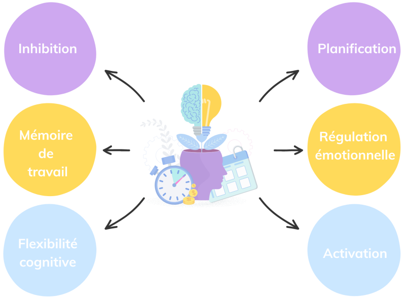 La flexibilité cognitive : C’est la capacité à s’adapter, à changer de façon de penser ou à passer facilement d’une tâche à une autre. Elle permet de s’ajuster quand les priorités changent ou quand une nouvelle situation se présente.
